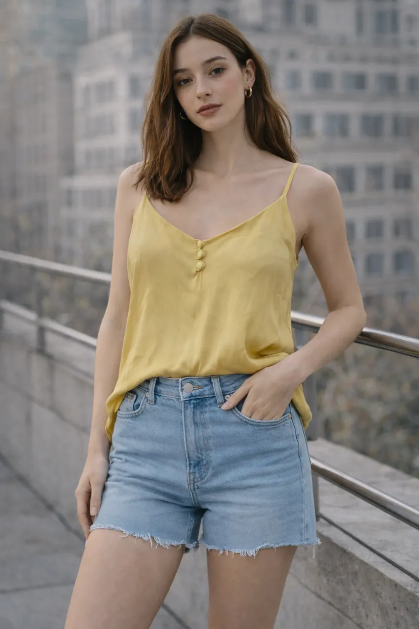Remera amarilla de seda con breteles finos y escote en V. Tiene tres botones en la parte delantera. Ideal para un look casual y fresco.
