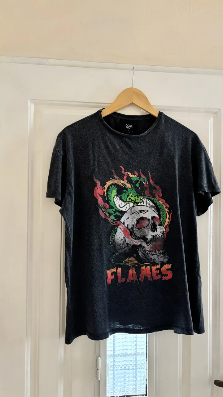 Remera gris con estampa de calavera, dragón y llamas. Ideal para un look rocker o casual.