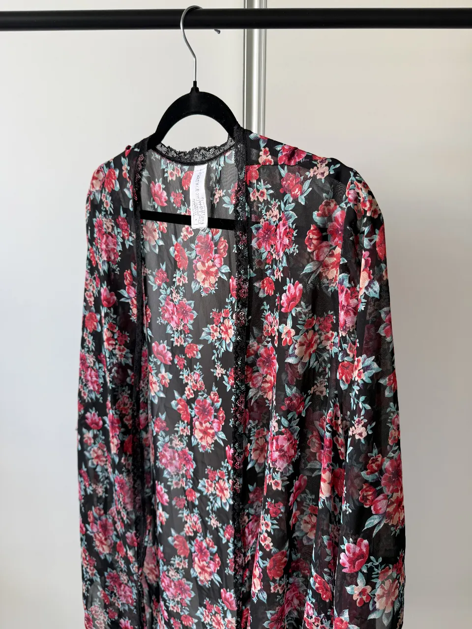 Kimono liviano con estampado floral vibrante en tonos rojos, rosas y verdes sobre fondo negro. Posee detalles de encaje en el cuello y puños. Ideal para usar abierto o atado con su cinturón, aportando un toque bohemio y delicado a cualquier outfit.