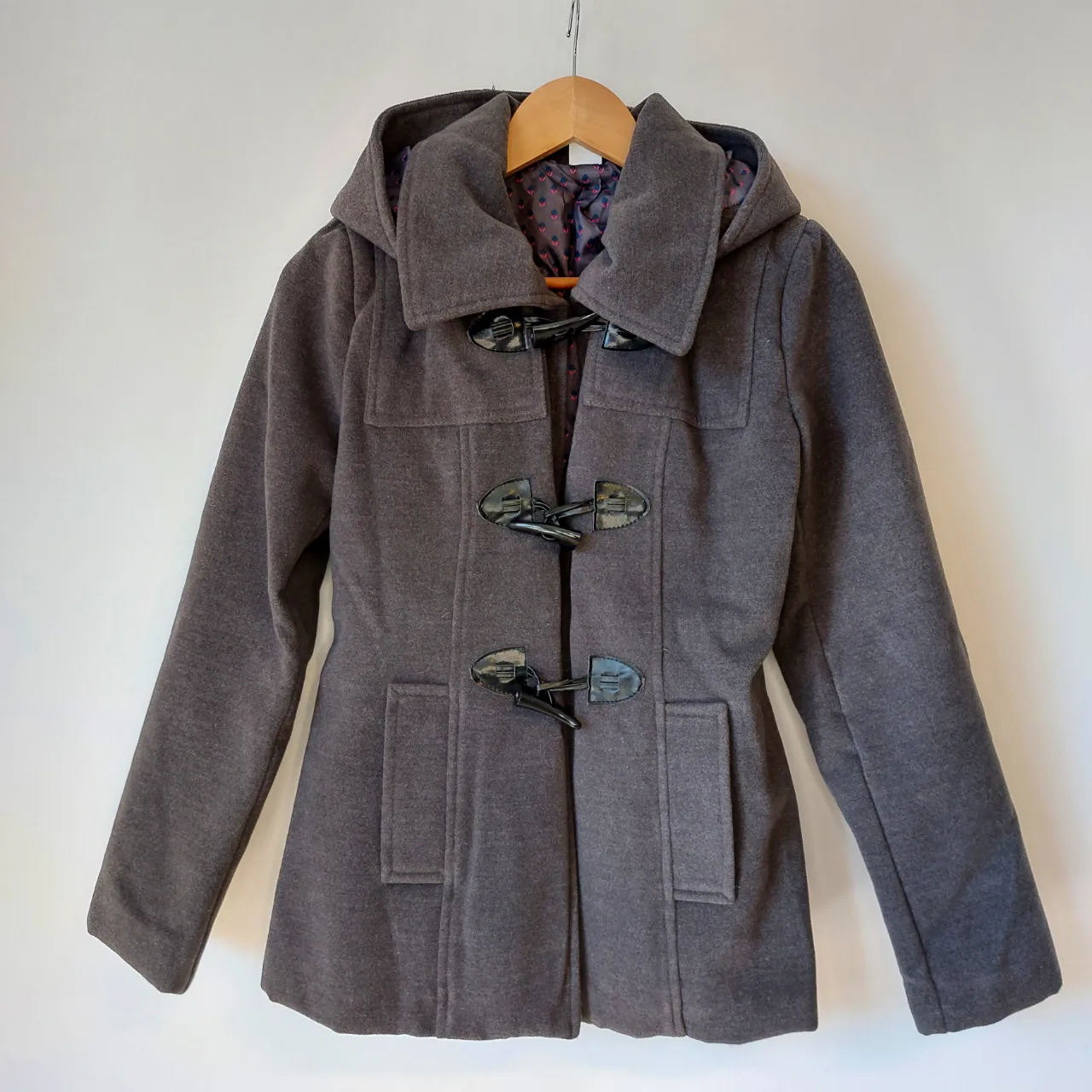 Montgomery de paño gris con capucha, cierre de broches y cuello alto. Capucha desmontable. Posee bolsillos frontales y forro interior estampado