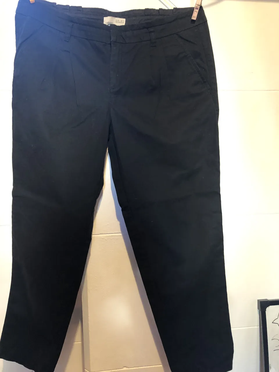Pantalón negro de tela con bolsillos delanteros y traseros.