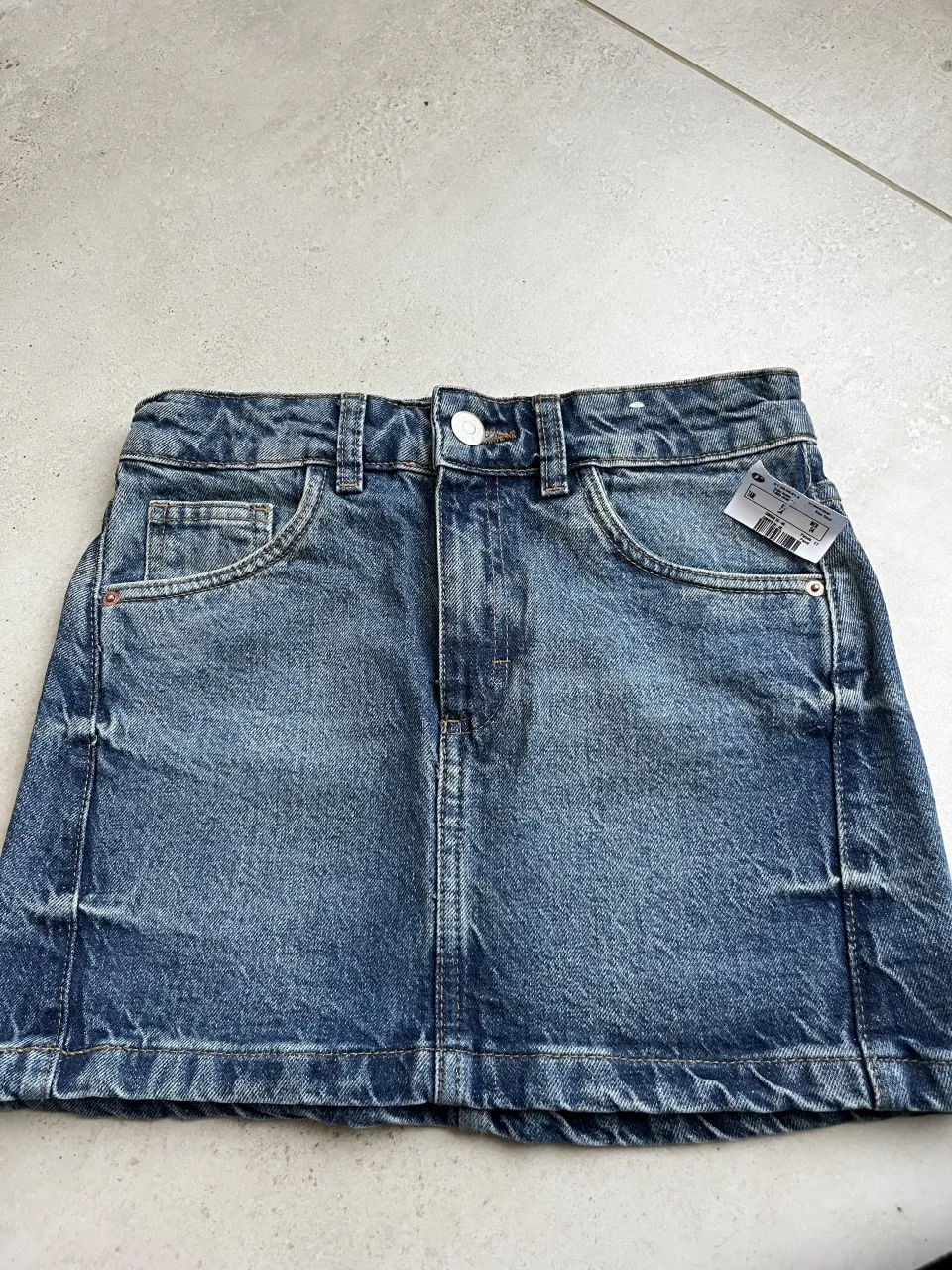 Pollera de jean azul con bolsillos delanteros y traseros. Cierre y botón en la parte frontal.