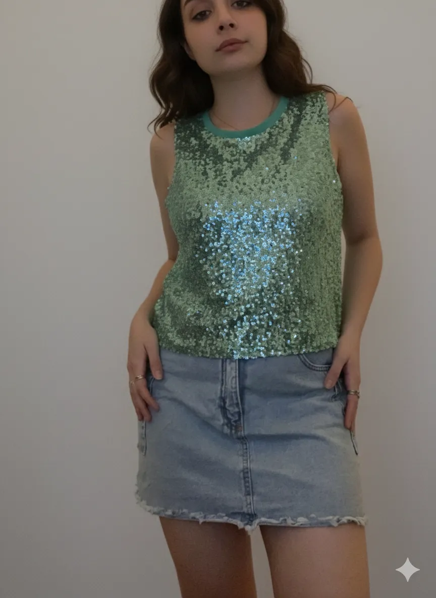 Top de lentejuelas verde menta, ideal para destacar en cualquier salida. Su diseño sin mangas y el brillo de las lentejuelas lo hacen perfecto para un look festivo y moderno.