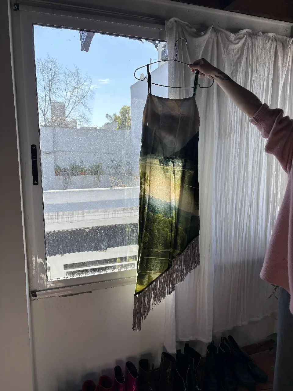 Vestido midi con estampado de paisaje, tirantes finos y flecos en el bajo. Ideal para eventos especiales o salidas nocturnas.