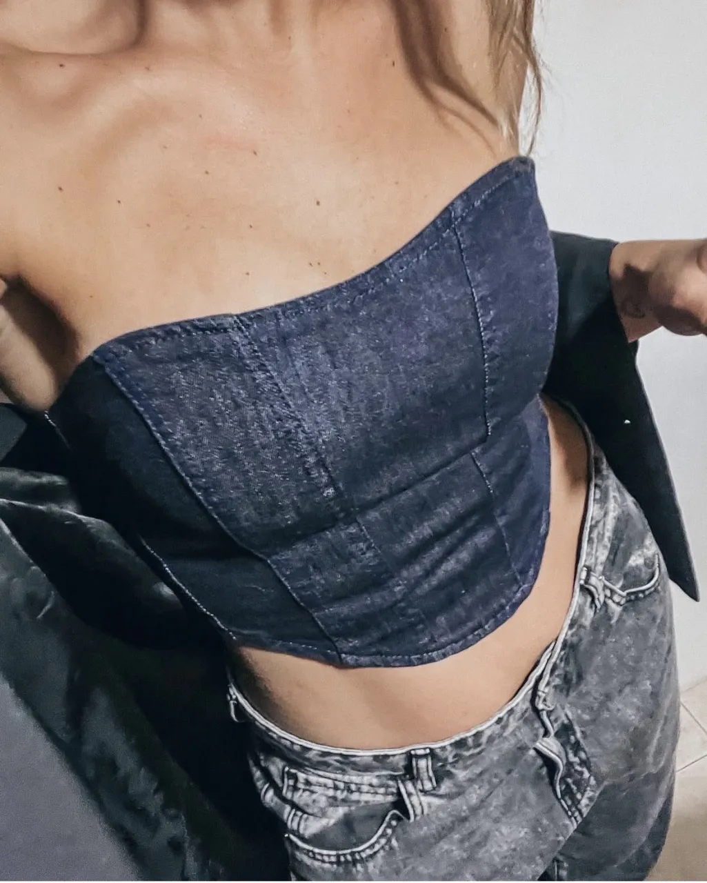 CORSET KOSIUKO| TALLE S Top de jean strapless, con detalles de costuras y corte al cuerpo.