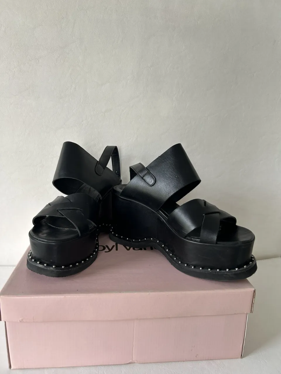 Sandalias negras con plataforma y tiras cruzadas en el frente. Tienen hebilla para ajustar en el tobillo y tachas alrededor de la suela.