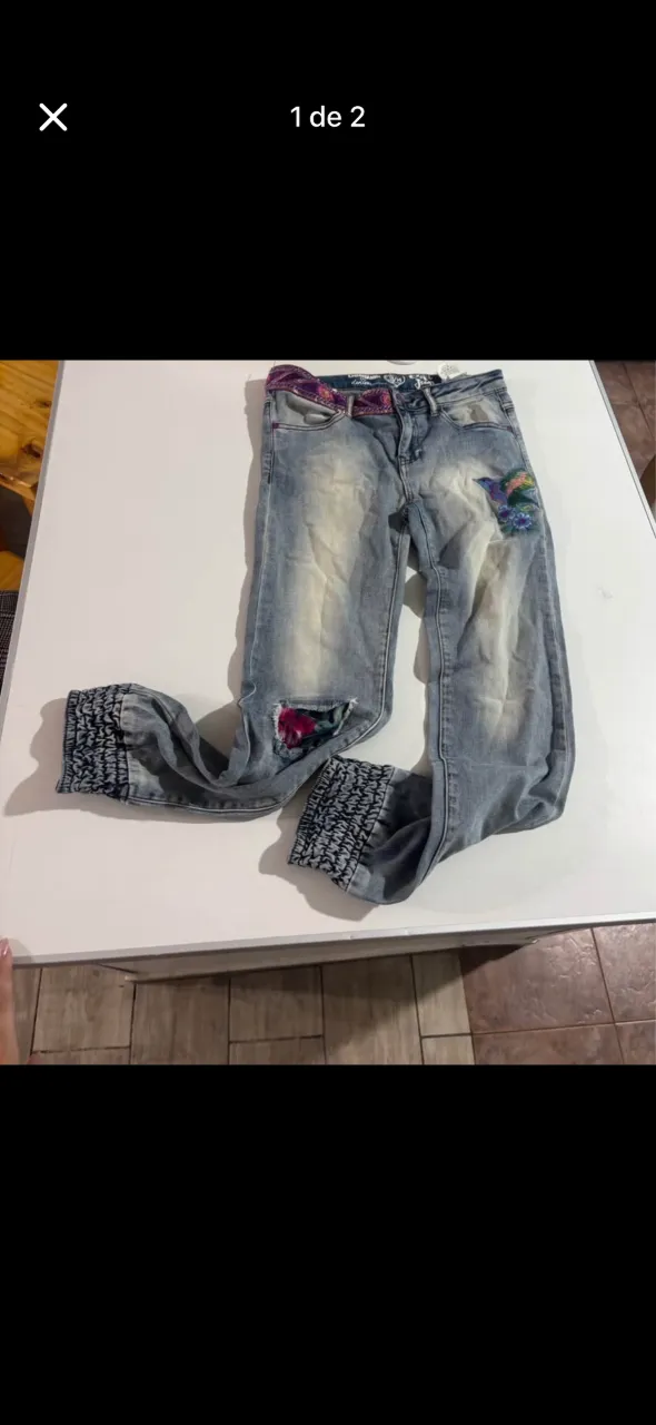 Jeans de tiro medio con parches de mariposas y flores en la parte delantera y trasera. Los bajos de los pantalones tienen un estampado floral y un detalle de fruncido. Incluye un cinturón tejido con detalles de lentejuelas y bordados.