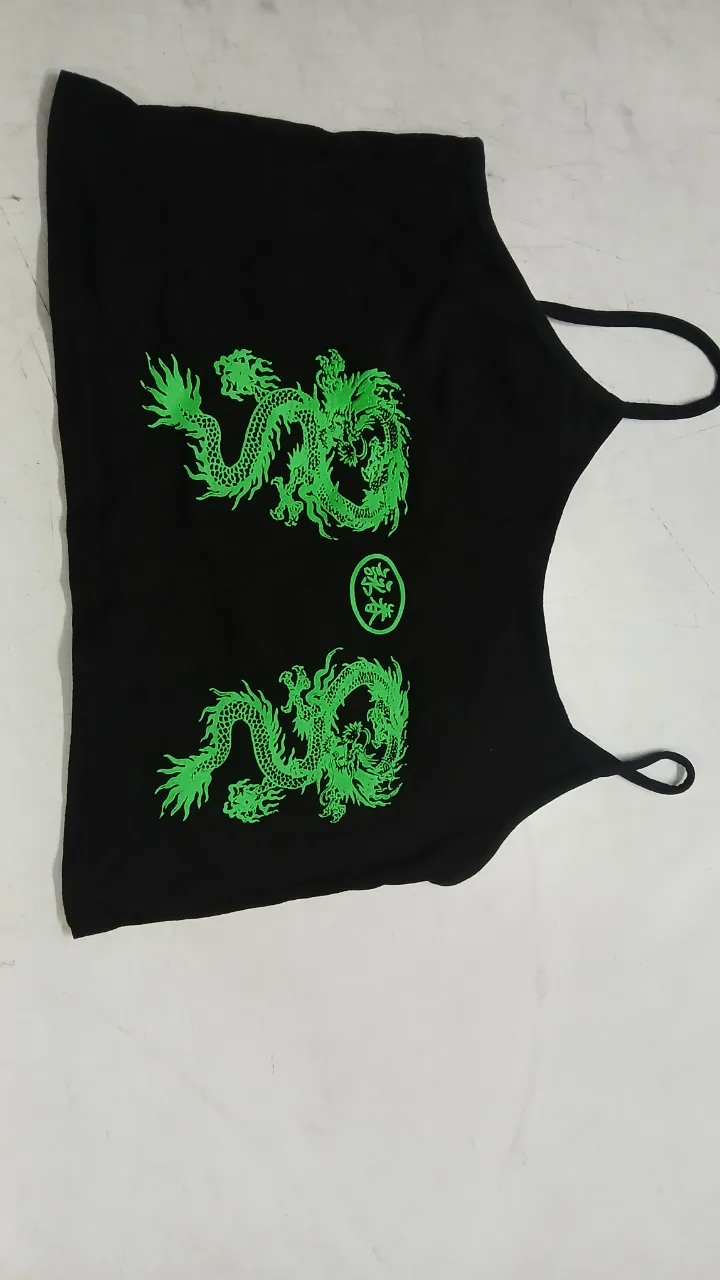 Top negro con estampa de dragones verdes, ideal para un look canchero y moderno. Perfecto para salidas informales o festivales.