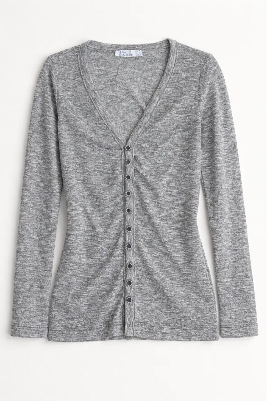 Campera importada fina gris melange de manga larga con escote en V y botones al frente.