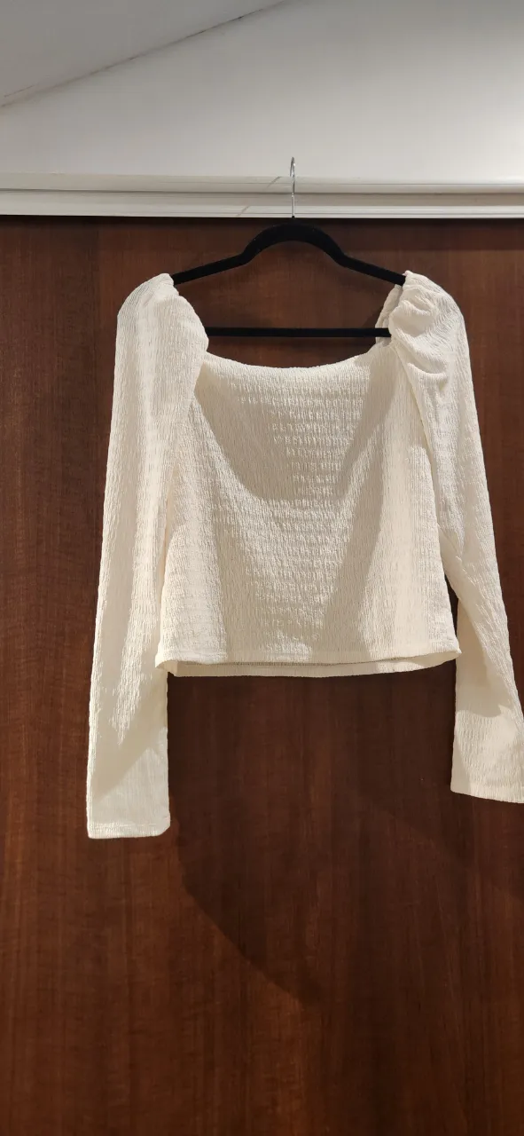 Blusa blanca escote cuadrado con mangas largas abullonadas y textura. Un top súper canchero y versátil para usar de día o de noche.