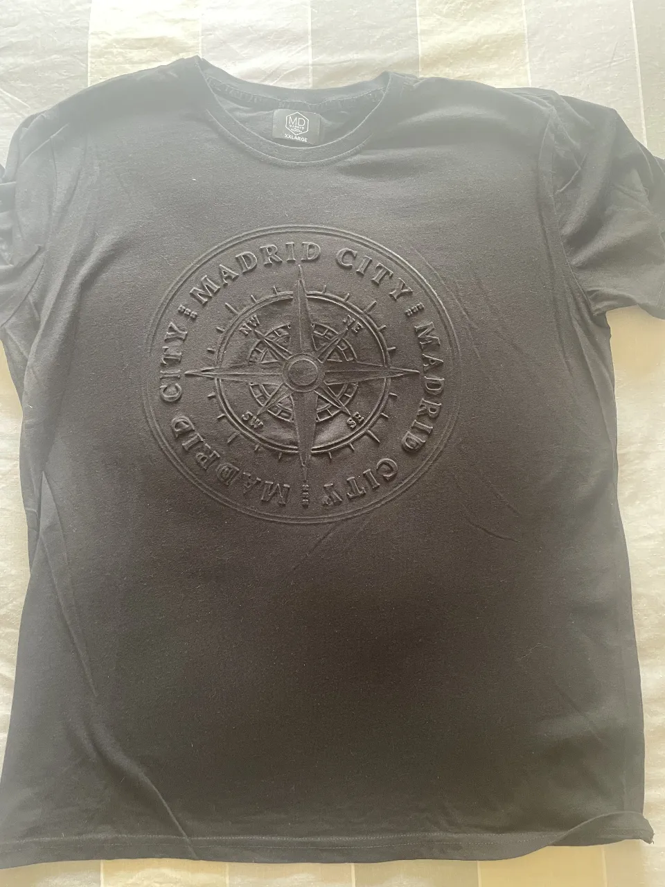Remera negra con estampa circular de brújula y "Madrid City" en relieve. Ideal para un look urbano y moderno.