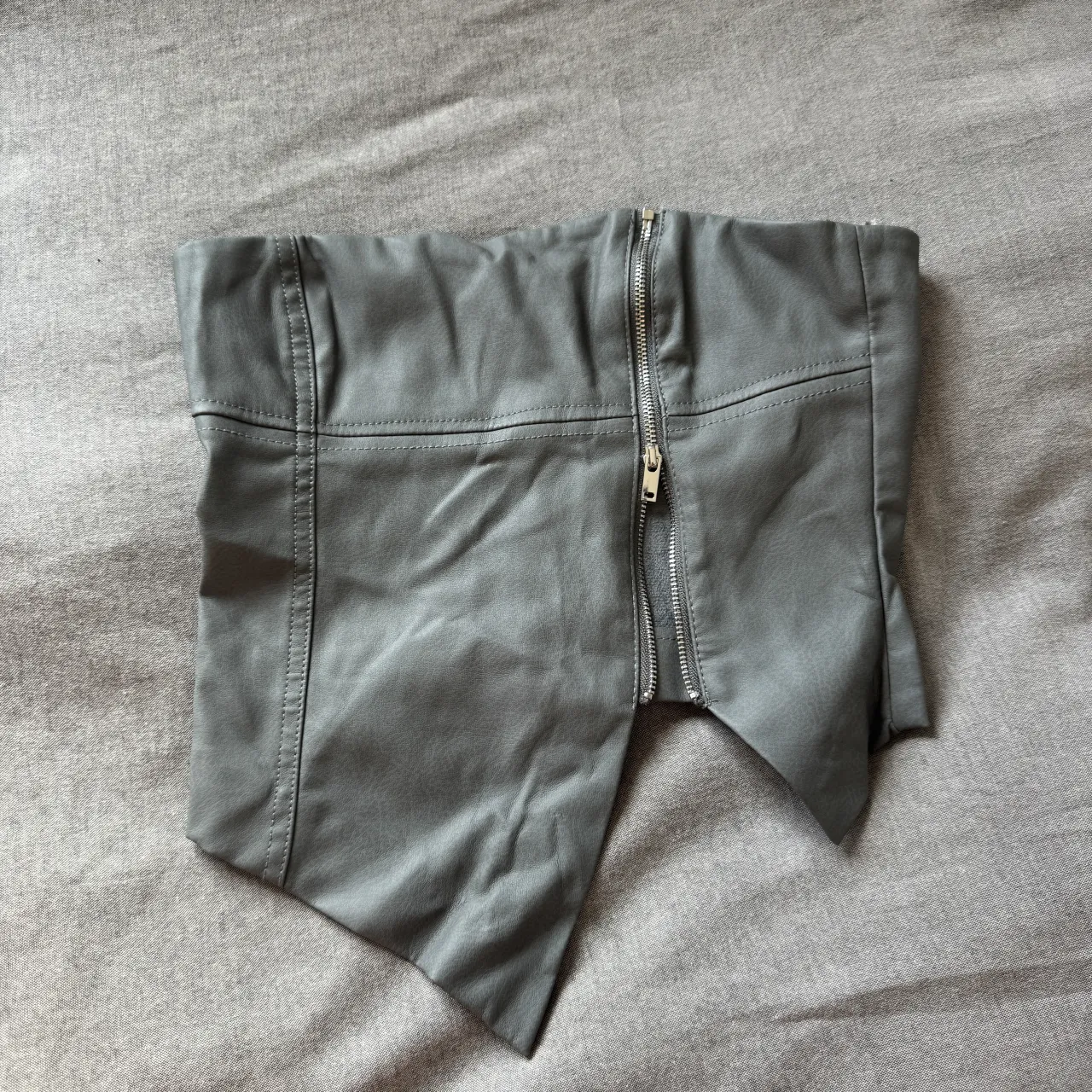Top estilo corset de cuero sintético gris, con cierre metálico al frente y detalles de costura.