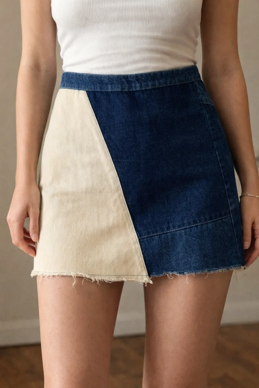 Pollera de jean con recortes de tela en color celeste y azul. Diseño moderno y original con detalles desflecados en la parte inferior. Ideal para un look canchero y descontracturado.
