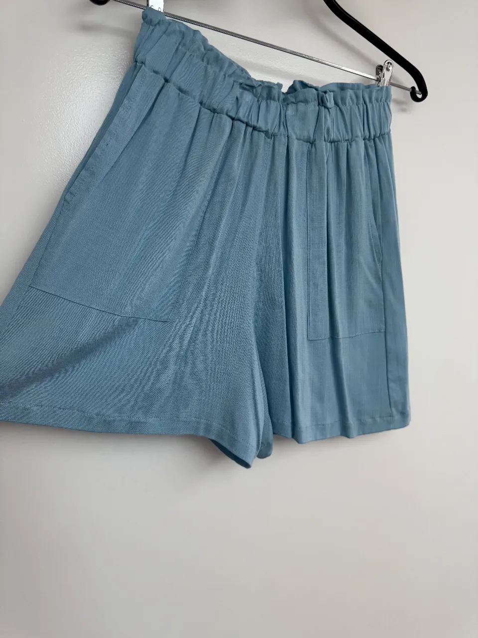 Conjunto de top y shorts de lino color azul celeste. El top es de breteles finos con fruncido y escote cuadrado. Los shorts son tiro alto con cintura elastizada y bolsillos. Ideal para un look fresco y cómodo.