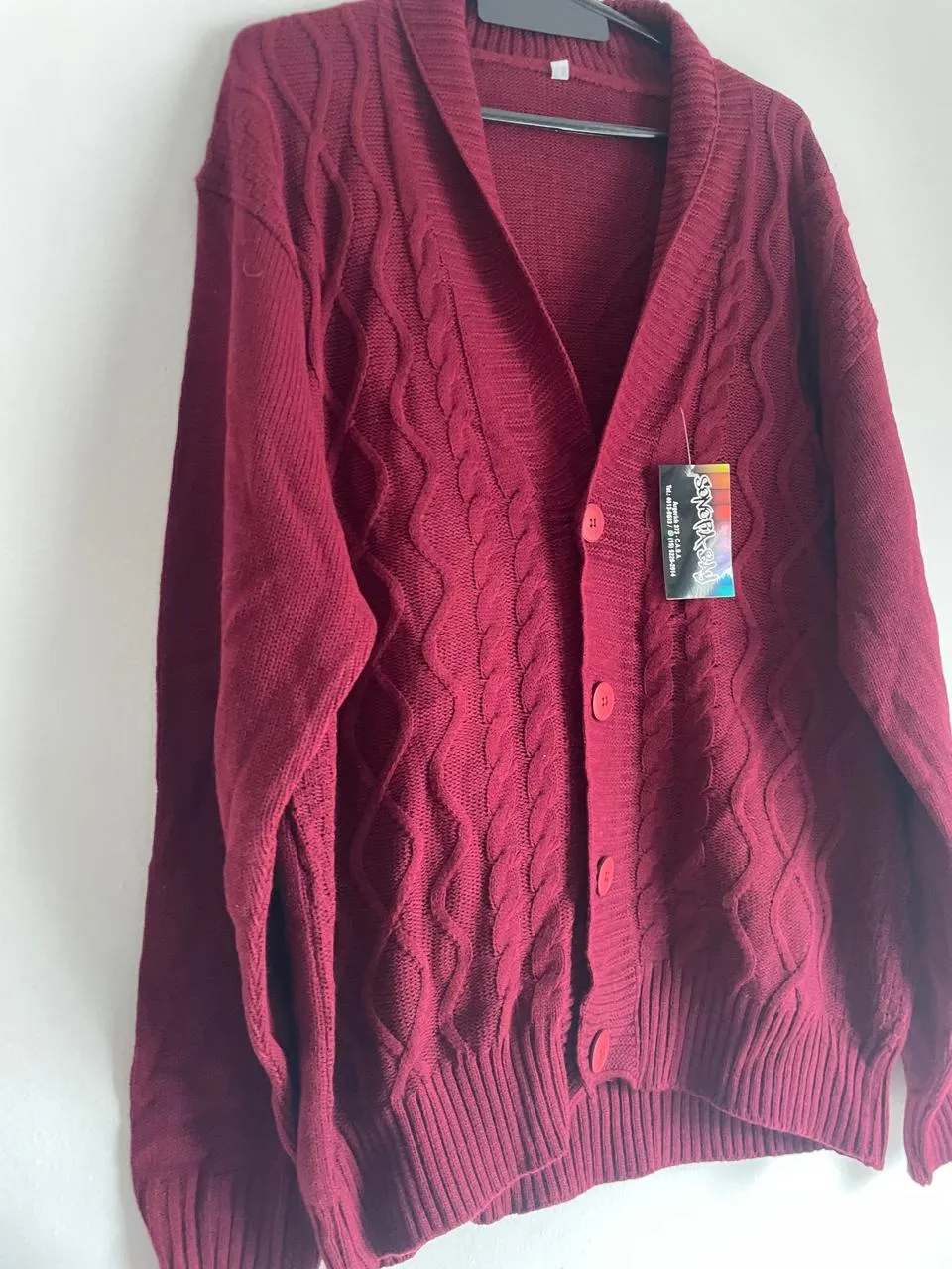 Cardigan de lana tejido con botones al frente y cuello tipo solapa. Posee un diseño de trenzas en toda la prenda.