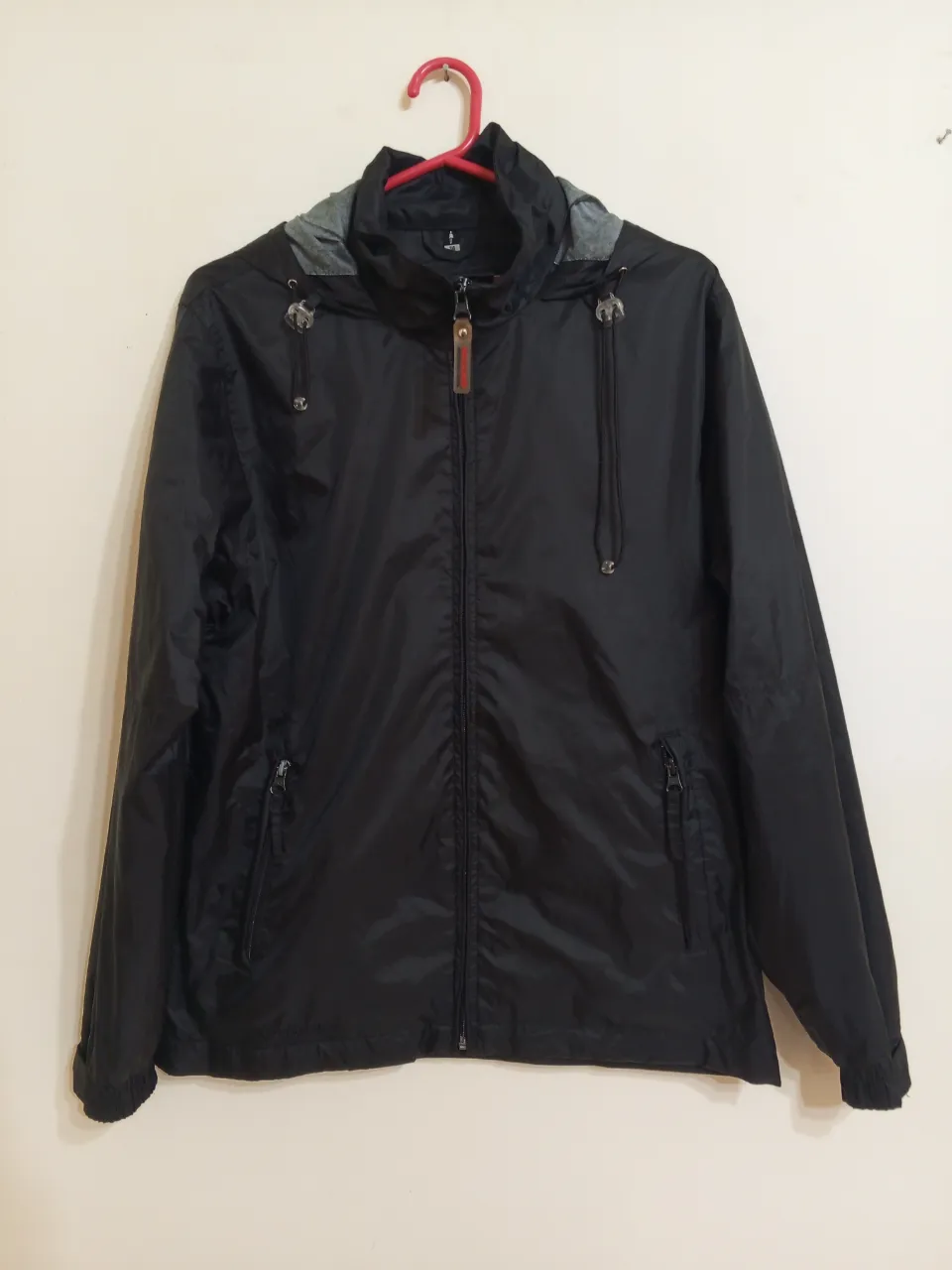 Campera rompeviento / impermeable negra con capucha, cierre al frente y bolsillos con cierre. Marca Northland. Ancho 50 cm / largo 65 cm / manga 60 cm.