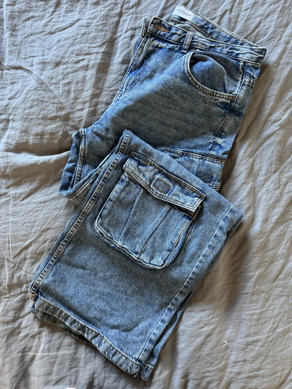 Jean de tiro alto con bolsillos cargo en los laterales. Posee bolsillos traseros con tapa y detalles de costuras.