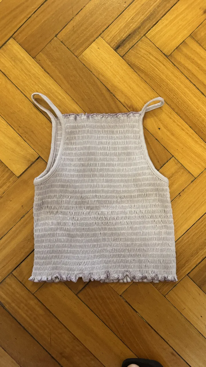 Top lila con tiras finas y textura fruncida. Un básico súper canchero para combinar con todo.