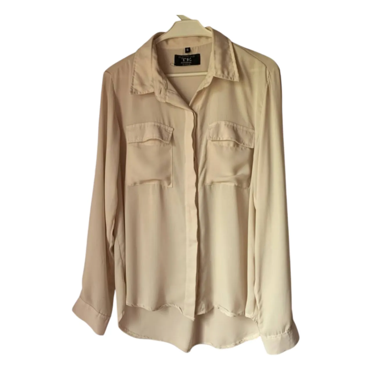 Camisa de gasa manga larga color beige con dos bolsillos en el frente y botones. Medidas: Hombros: 37 cm Axila: 50 cm Cadera: 50 cm Largo camisa: 70 cm Largo manga: 55 cm