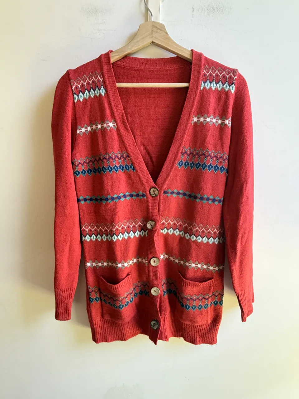 Cardigan rojo con botones de madera y bolsillos delanteros. Presenta un estampado geométrico en tonos blanco, azul y verde en el frente.