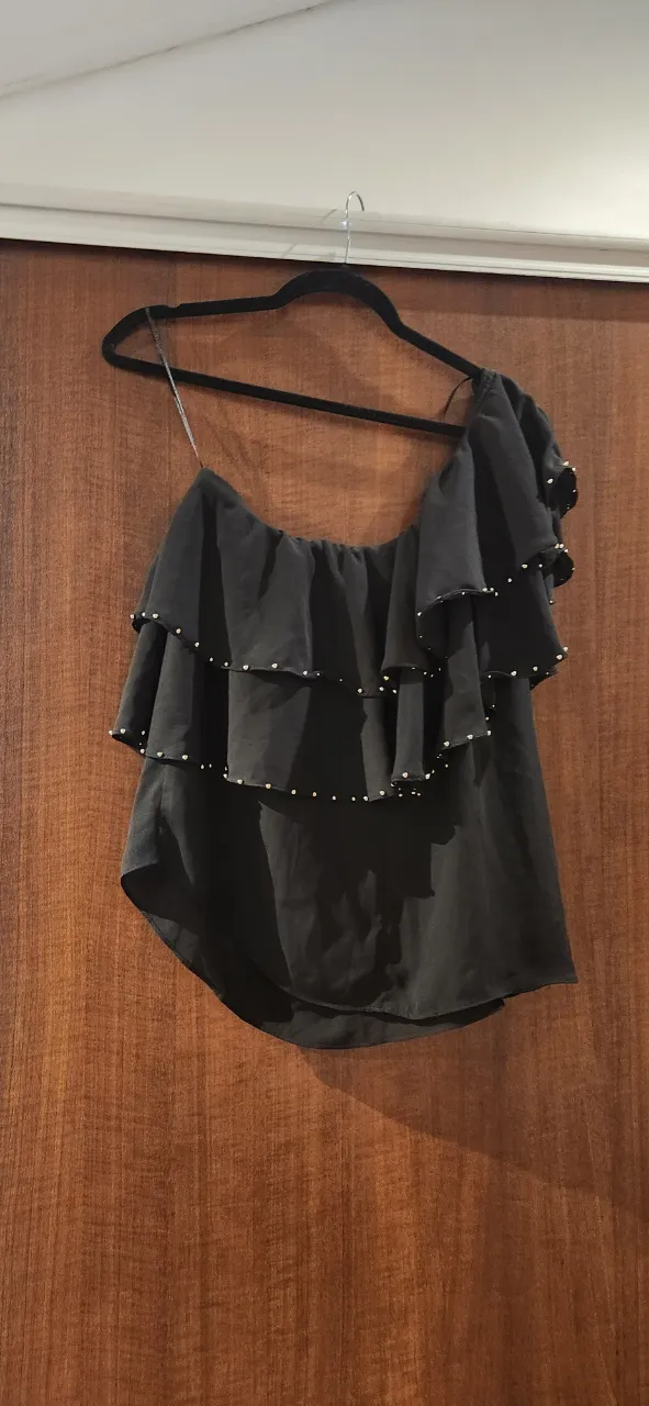 Top negro con volados y detalles de tachitas plateadas. Diseño asimétrico de un solo hombro, ideal para eventos o salidas nocturnas.