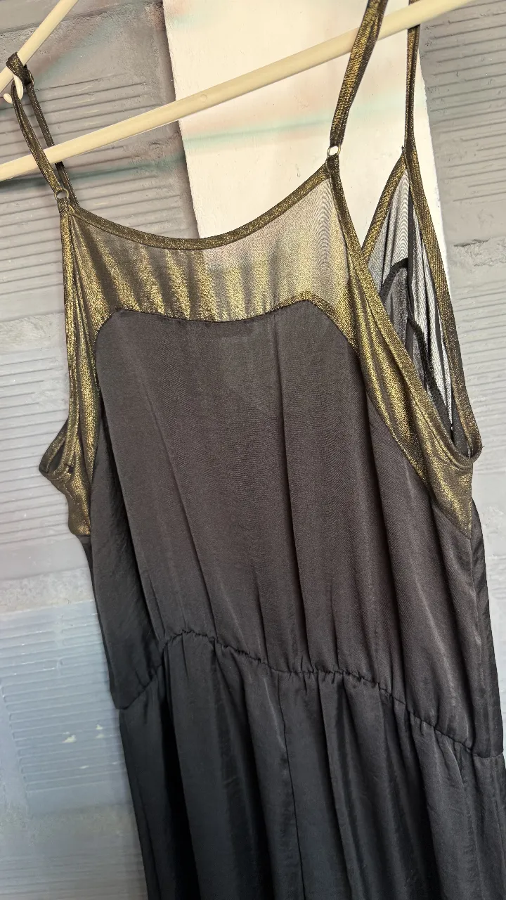 Mono largo negro con detalles dorados en el escote y tiras finas. Ideal para una salida o fiesta.