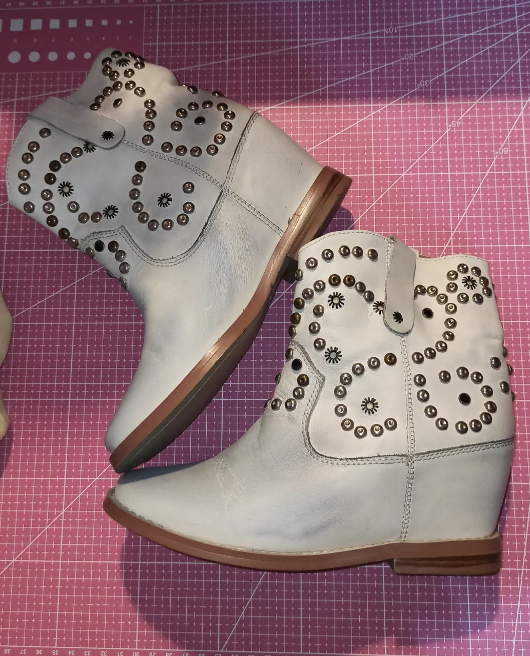 Botitas de cuero blancas con tachas y diseño grabado. Un modelo súper canchero y original para darle un toque único a tus looks.