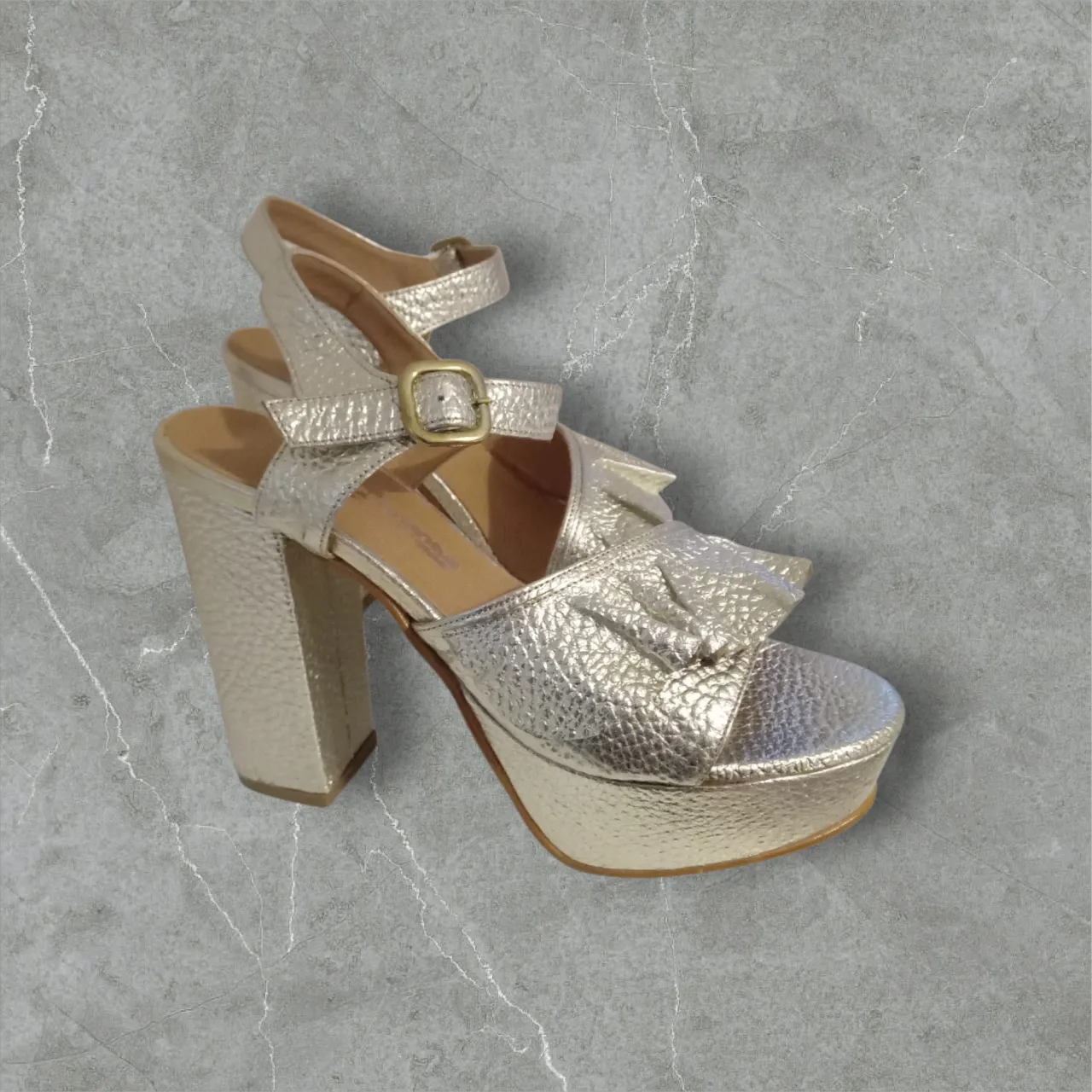 Sandalias plateadas con plataforma y taco alto. Tienen tiras finas en el empeine con detalle de volados y una tira con hebilla en el tobillo.