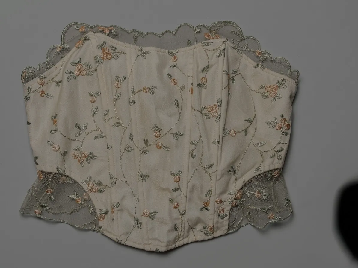 Corset blanco con bordado de flores y hojas en tonos rosa pálido y verde. Posee detalles de encaje en el borde superior e inferior.