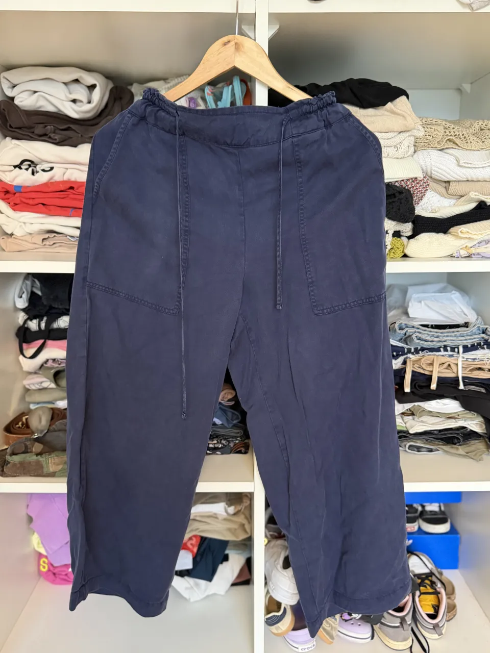 Pantalón azul marino con cordón ajustable en la cintura y bolsillos delanteros.