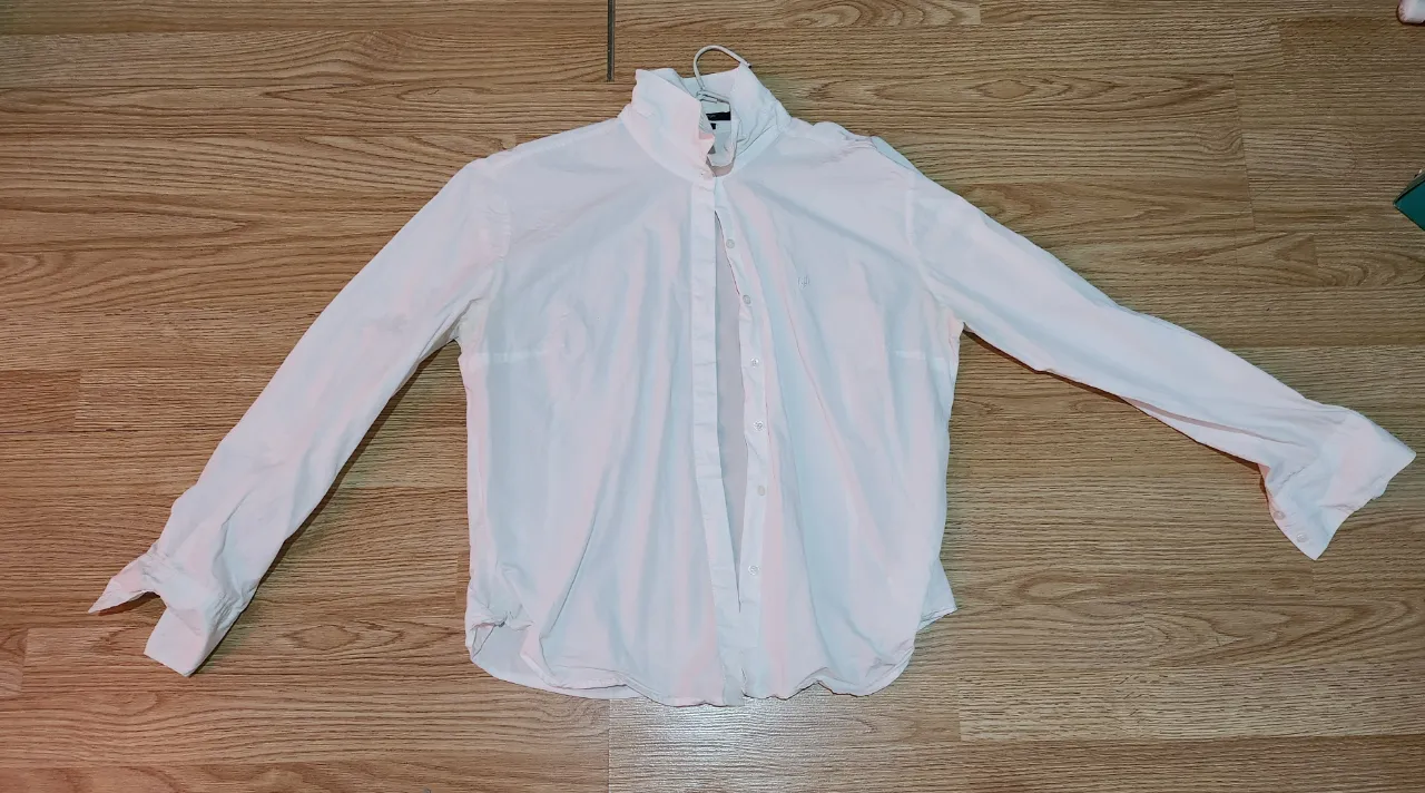 Camisa blanca de manga larga con cuello mao. con manchas amarillas[ no se notan tanto] en la parte de la axila, por el uso hombro: 45cm ; sisa: 50cm ; largo: 62cm