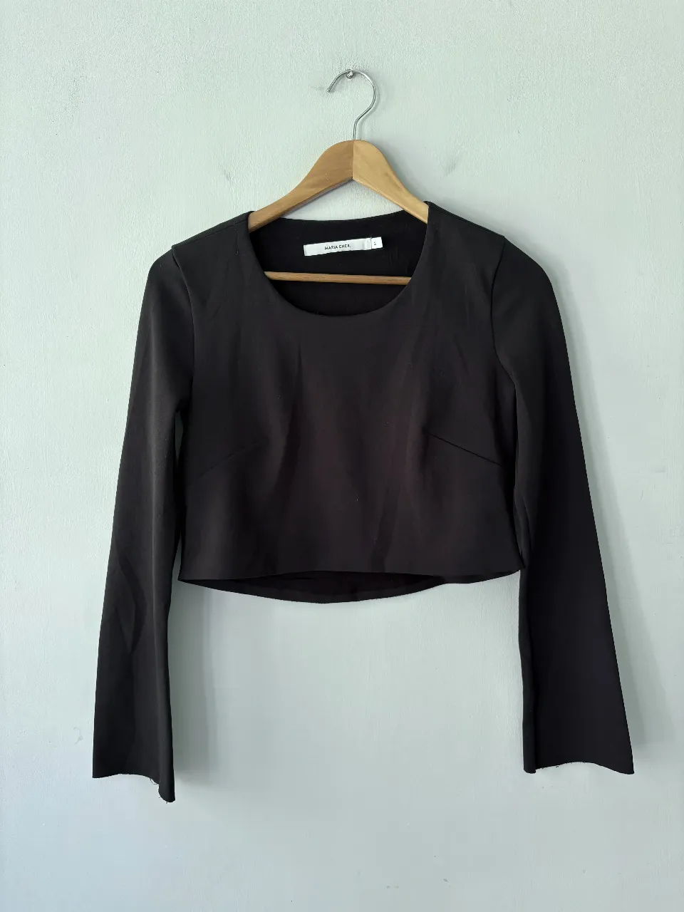 Top negro manga larga, escote redondo y corte al cuerpo. Ideal para un look canchero y moderno.
