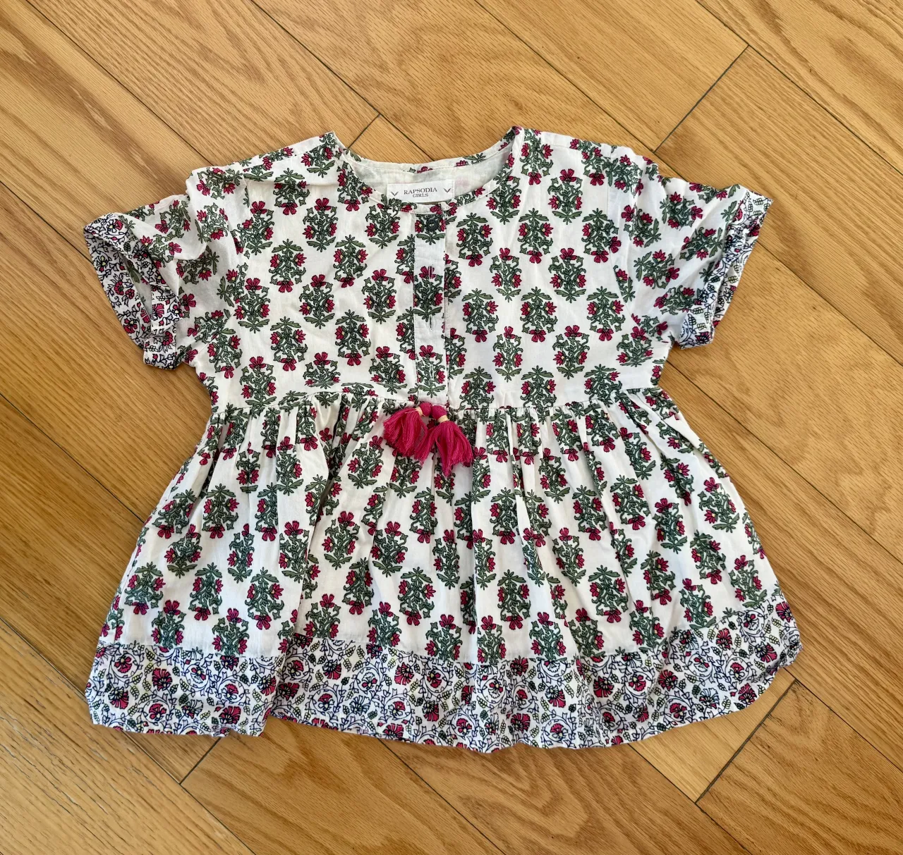 Blusa color crudo con estampa floral fucsia y verde. Detalle de pompones y pequeños botones en escote que se puede abrir. Está forrada. Made in India