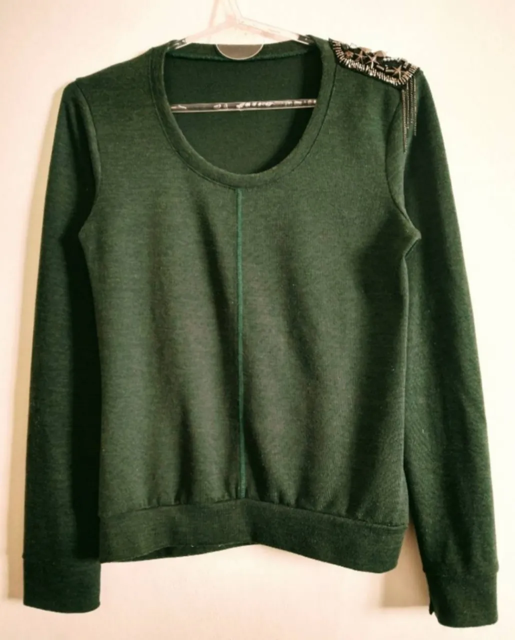 Buzo liviano verde oscuro, jaspeado, con cuello redondo y detalles de pedrería y cadenas en un hombro.