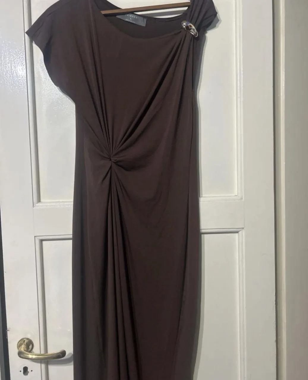 Vestido largo marrón con drapeado y detalle de broche plateado en el hombro.