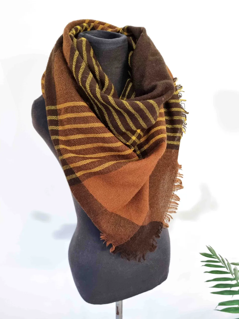 Bufanda de cuadros escoceses en tonos marrones y amarillos. Posee flecos en los bordes. Medida 112x112 cm.