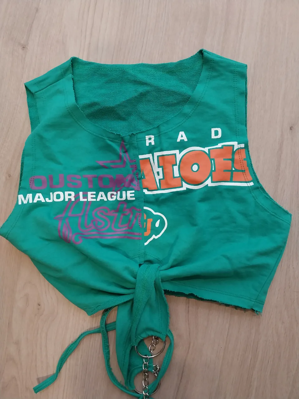Top corto verde con estampa "Major League" y "Aloha". Tiene un nudo en la parte delantera con detalles de cadenas y argollas. Ideal para un look casual y moderno.