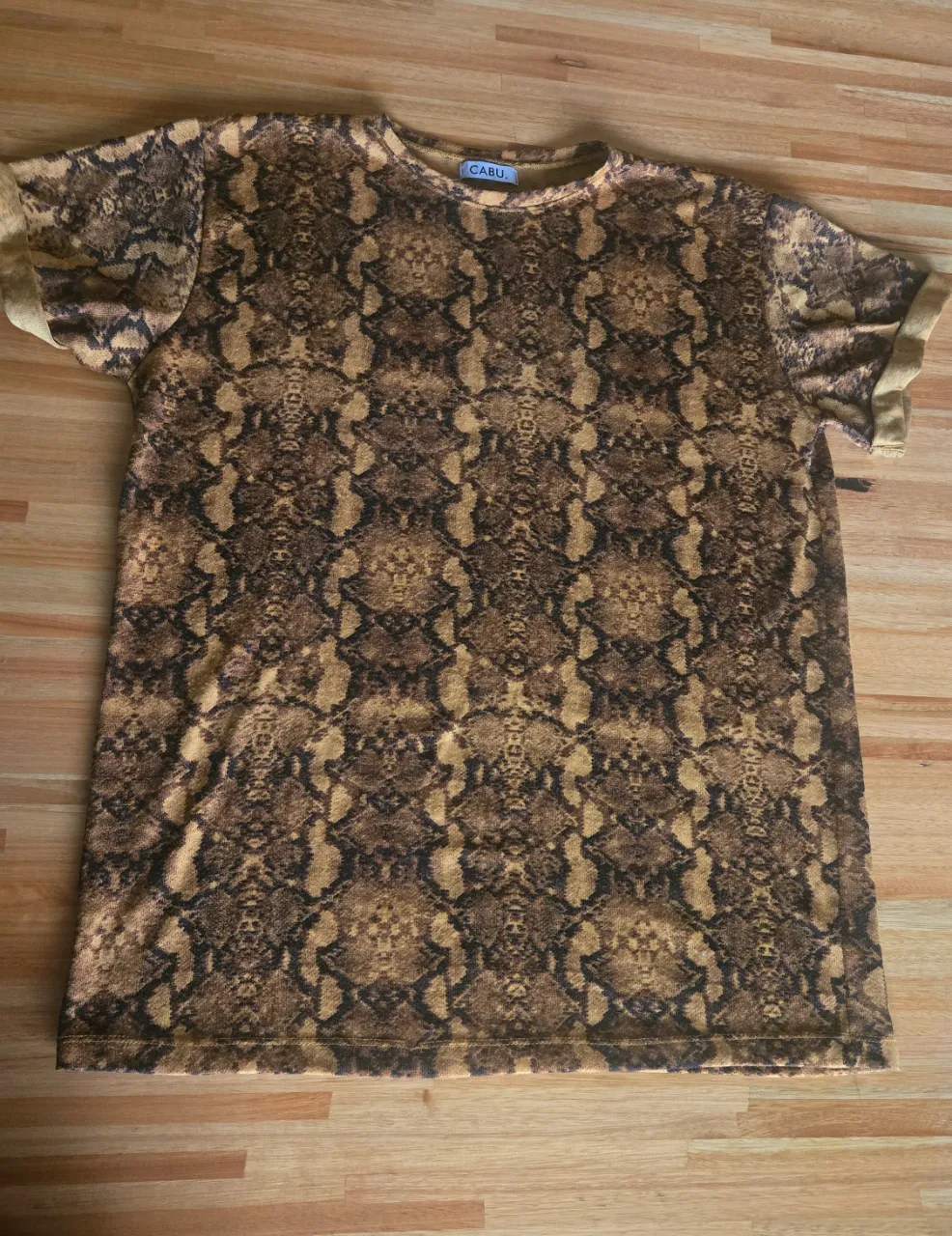 Remeron de manga corta de lanilla con estampa de serpiente en tonos marrones y negros. Cuello redondo.