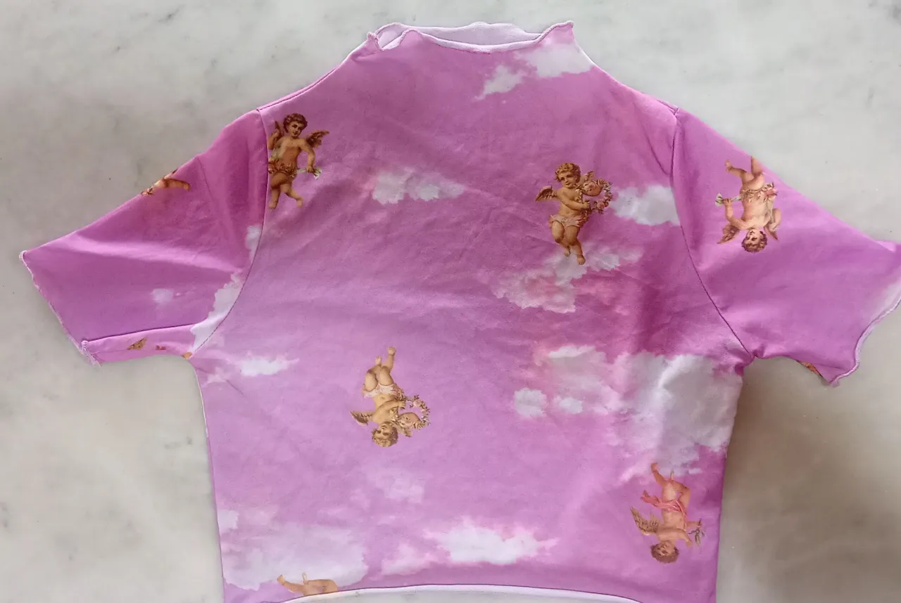 Remera manga corta con cuello alto y estampa de nubes y cupidos. Un diseño único y llamativo para destacar tu estilo.