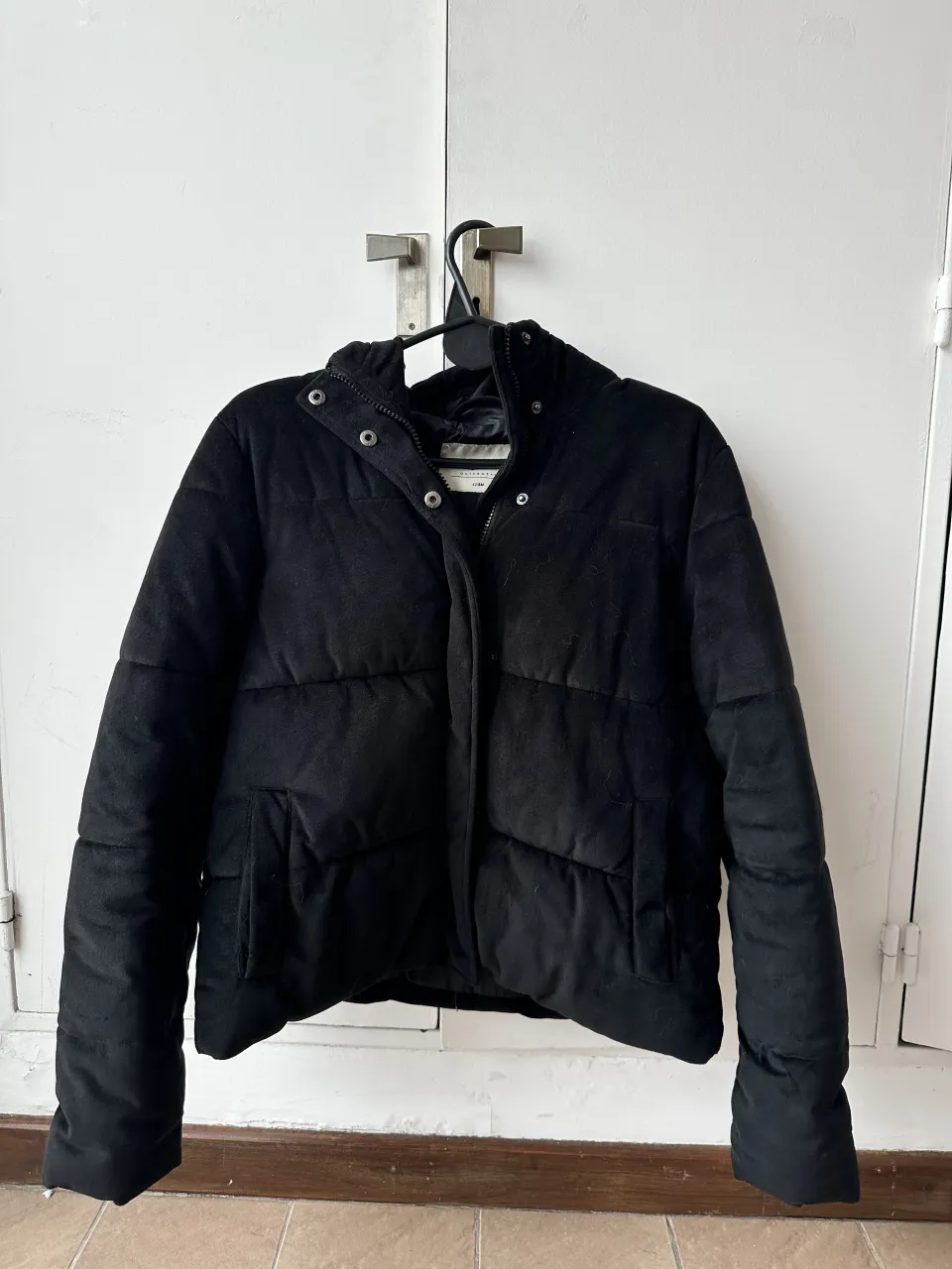 Campera negra acolchada con capucha. Cierre delantero y bolsillos laterales.