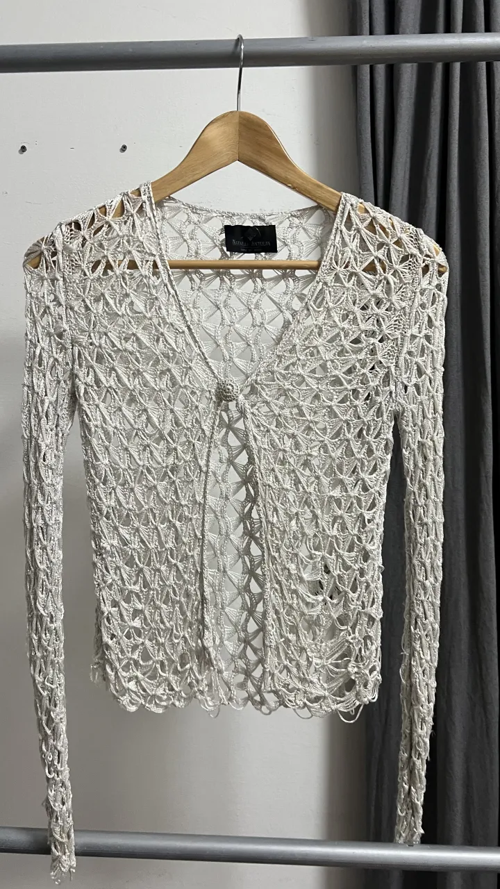 Cardigan tejido de hilo blanco, con un diseño calado y detalles de brillos. Posee un broche en la parte superior para cerrar. Ideal para un look elegante y sofisticado.