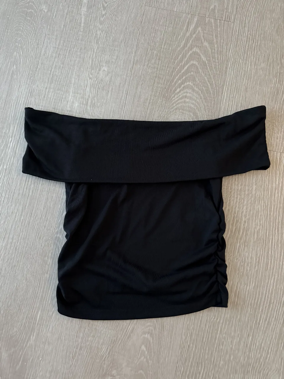 Top negro strapless con fruncido lateral. Ideal para un look canchero y sexy.
