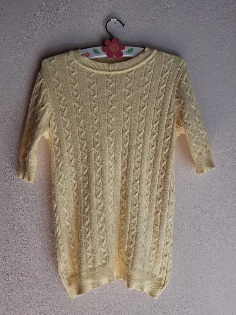 Sweater tejido color amarillo pálido con mangas cortas y cuello redondo. Presenta un diseño de trenzas verticales a lo largo de toda la prenda.