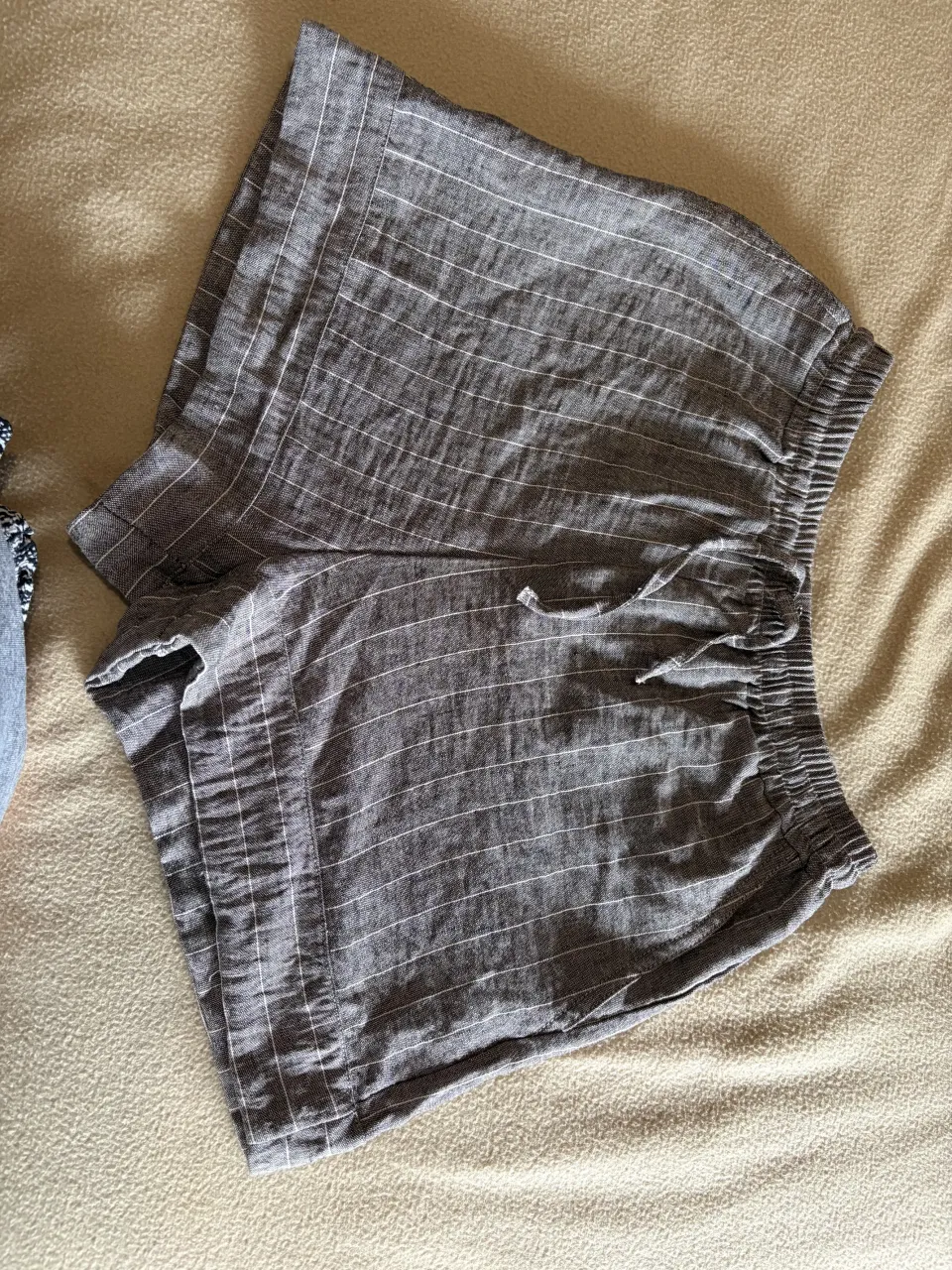 Shorts de lino a rayas grises con cordón ajustable y cintura elastizada. Ideales para un look casual y fresco.