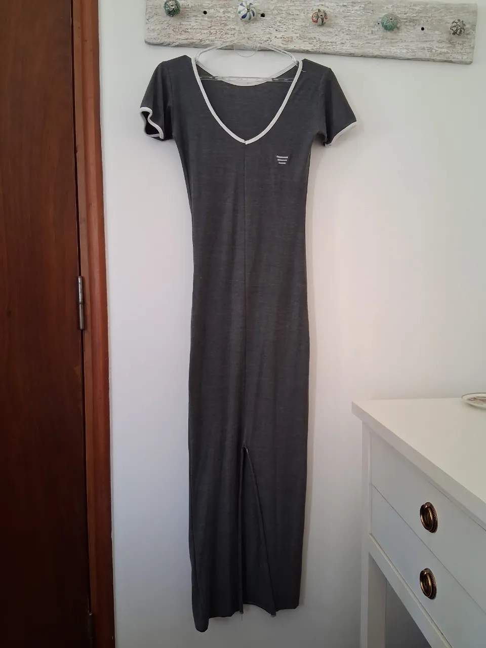 Vestido largo gris con escote en V y detalles blancos en el cuello y mangas. Posee una abertura en la pierna. Talle S. Medidas: axila a axila 41 cm, hombro a hombro 38 cm, largo 138 cm. Es elastizado. Para tener en cuenta, yo mido 1,63 cm y me llega hasta los tobillos.