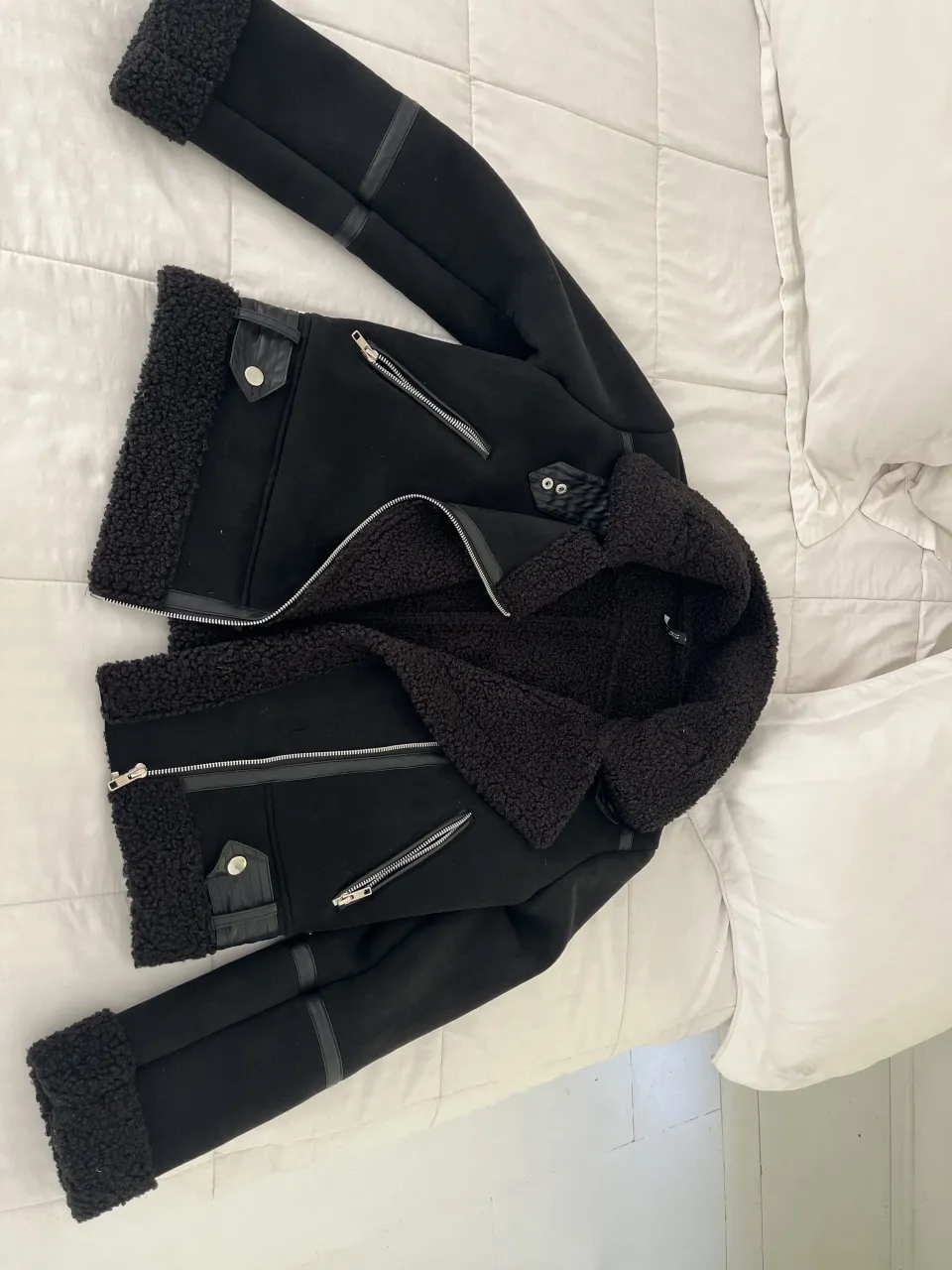 Campera negra con cuello y puños de corderito. Posee doble cierre metálico al frente y bolsillos laterales con cierre. Detalles de ecocuero en solapas y puños.