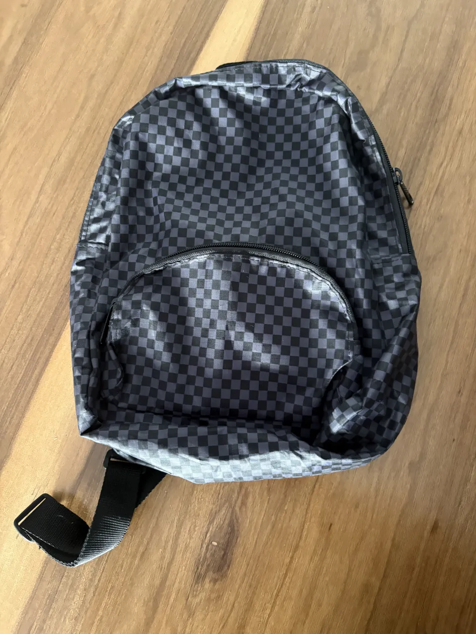 Mochila pequeña pero espaciosa con estampa de cuadros escoceses en gris y negro. Ideal para el día a día o para llevar lo esencial.