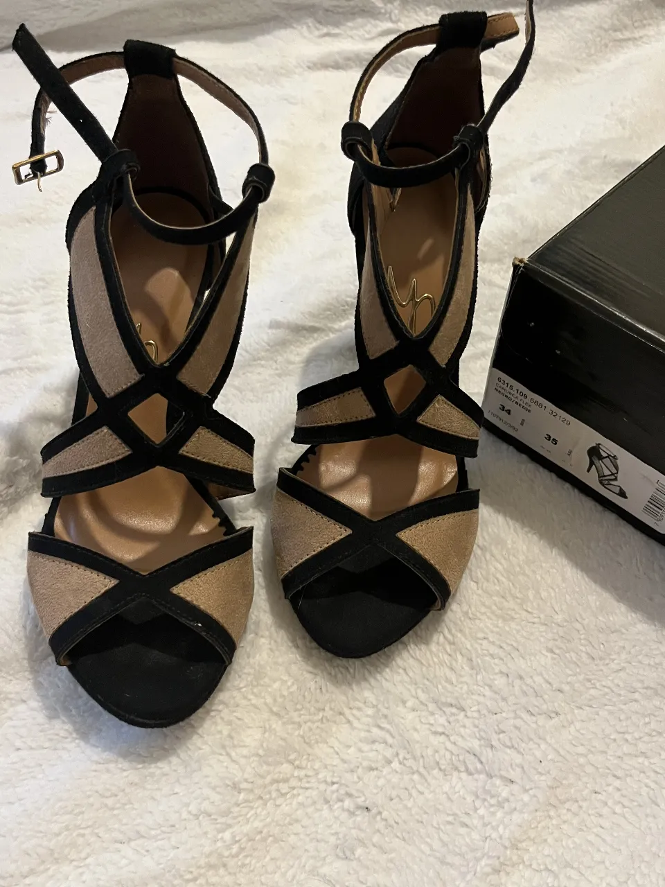 Sandalias de fiesta con tiras cruzadas en negro y beige. Taco alto fino y pulsera al tobillo para un ajuste perfecto. Ideales para complementar tu look en eventos especiales.