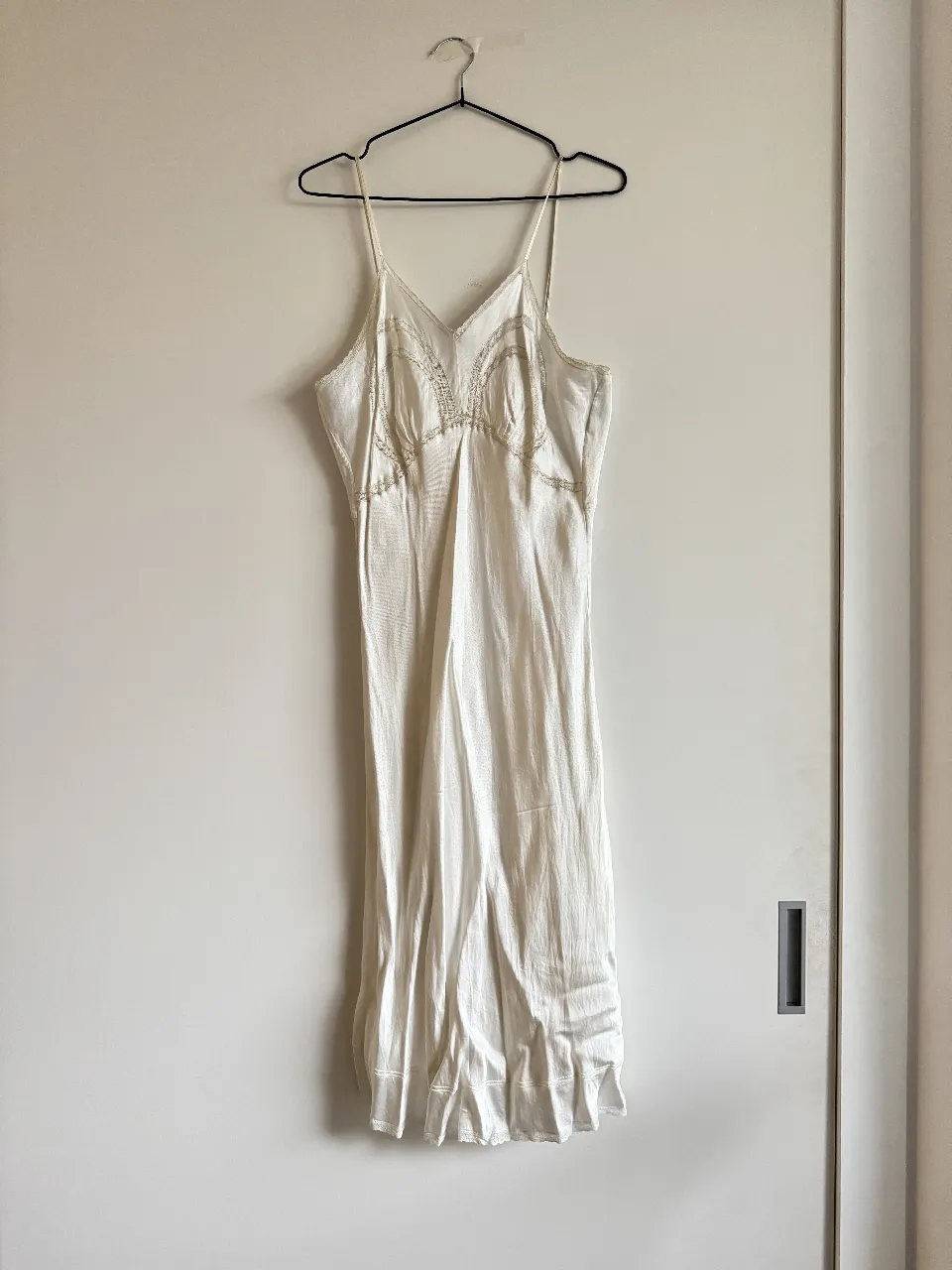 Vestido lencero de seda, con encaje en el escote y en el ruedo. Corte vintage, más al cuerpo en la parte del busto, y con muy buen movimiento debajo. Breteles finos y silueta recta. Ideal para un look romántico o como prenda base, y hasta para la noche con unos tacos🤍 Usalo también como vestido de civil, o para año nuevo✨ No tiene etiqueta de talle, pero yo soy L y me queda bien. Guiarse por las medidas. Medidas en cm (tomadas en plano - para contorno, multiplicar x2): axila a axila 46, cintura 40, cadera 54, largo (sin breteles) 102.