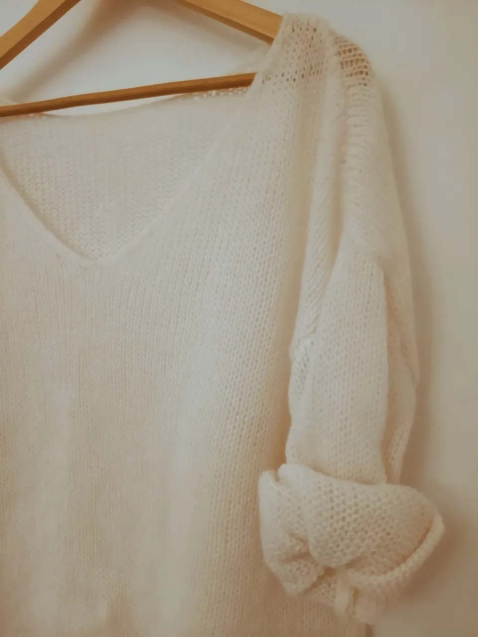 Sweater de tejido fino con cuello en V y mangas largas. Presenta un detalle de tejido calado en los hombros y puños enrollados. oversize